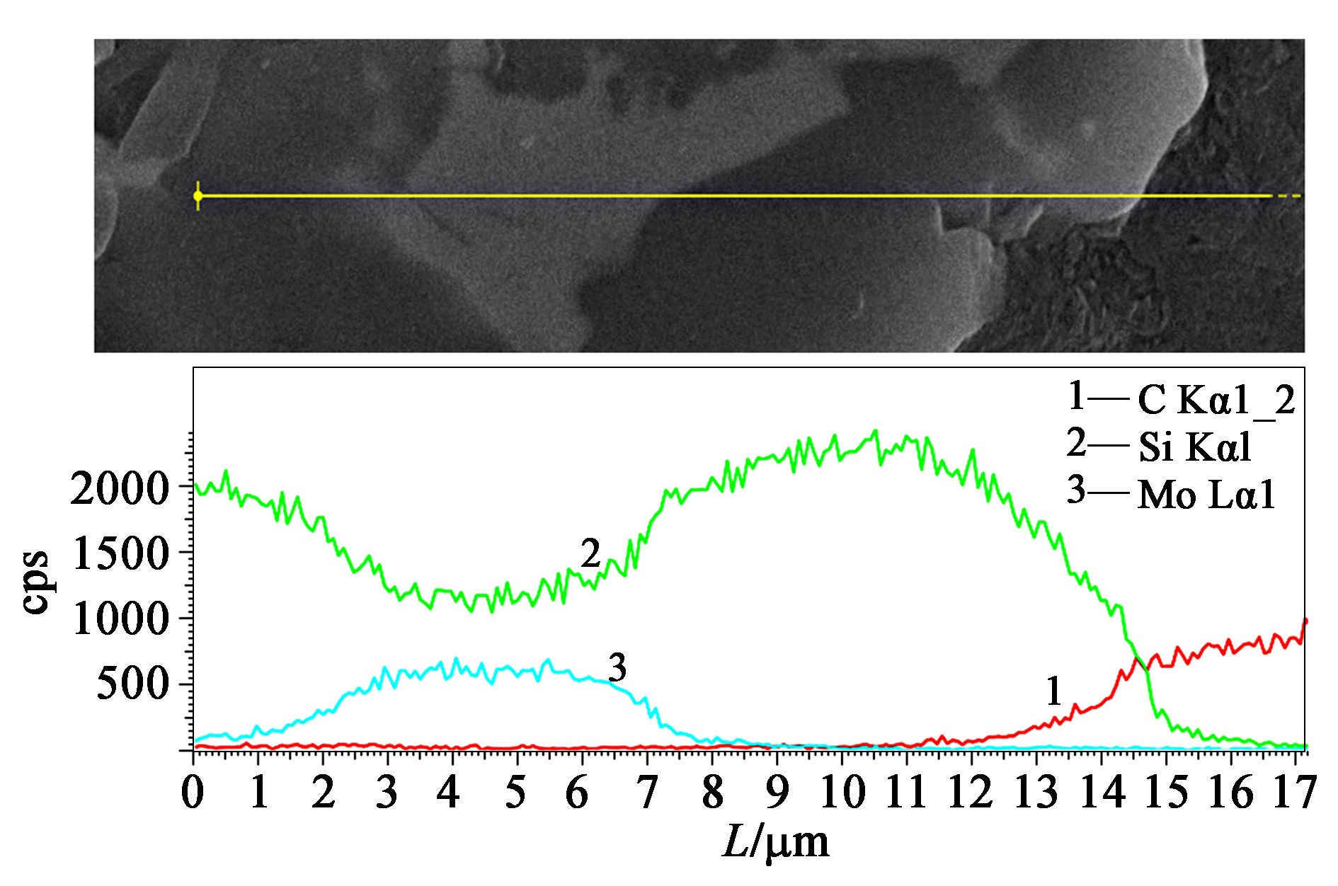 圖 3 為 GM 樣品的線掃描結(jié)果,從圖中可以看出,含鉬元素區(qū)域同時(shí)存在硅元素,并且鉬元素存在的區(qū)域被硅元素所包圍,與圖 2 觀察到的結(jié)果一致。