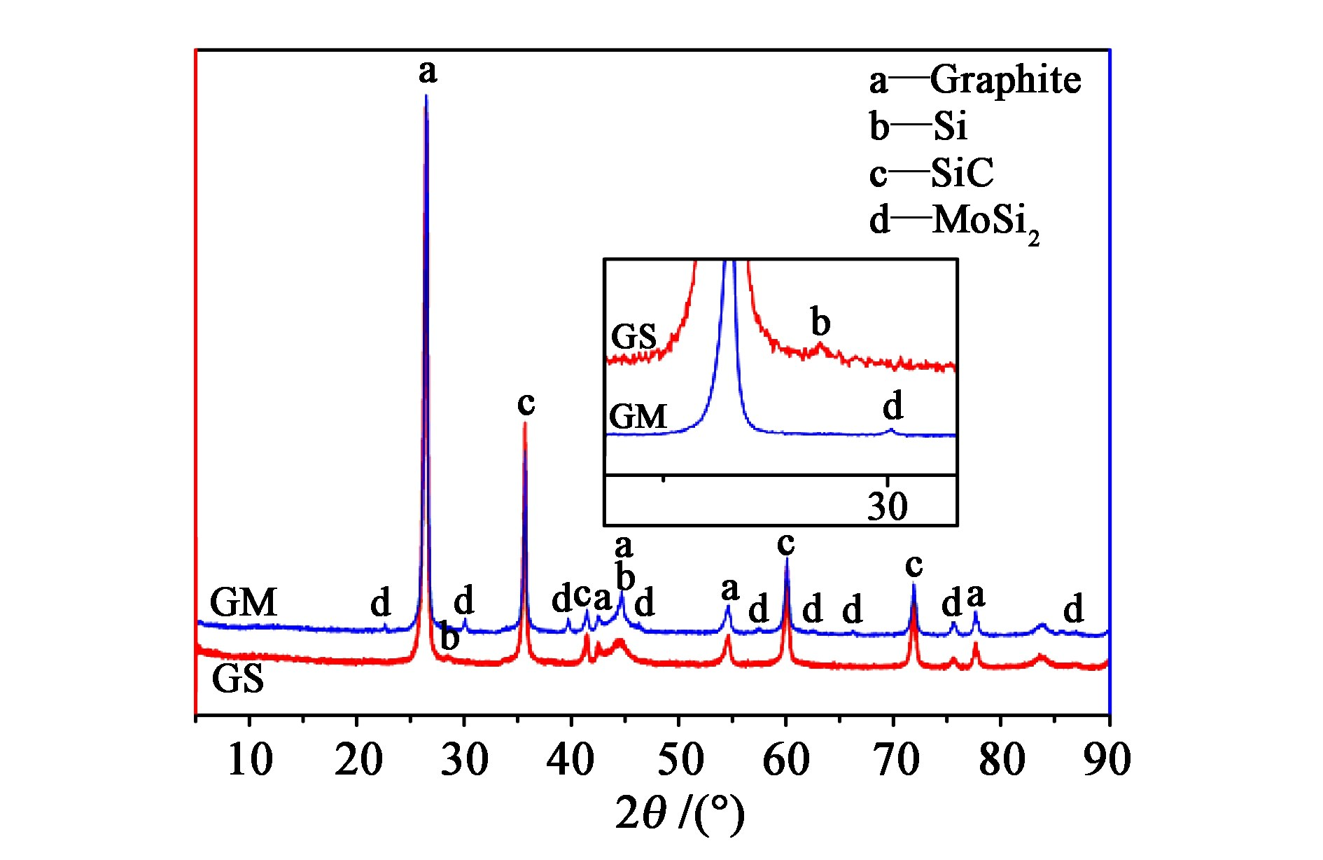 圖 5 為樣品的 XRD 圖譜,通過 XRD 結(jié)果可以看出,GS 樣品中存在石墨、碳化硅及少量硅物相,而 GM 樣品中僅檢測(cè)出石墨、碳化硅及二硅化鉬物相,未檢測(cè)出硅。 同時(shí),XRD 結(jié)果表明 GM 樣品中鉬以二硅化鉬的形式存在,與圖 3 線掃描結(jié)果相符,表明熔滲劑中加入二硅化鉬能夠消除熔滲后樣品中的自由硅。