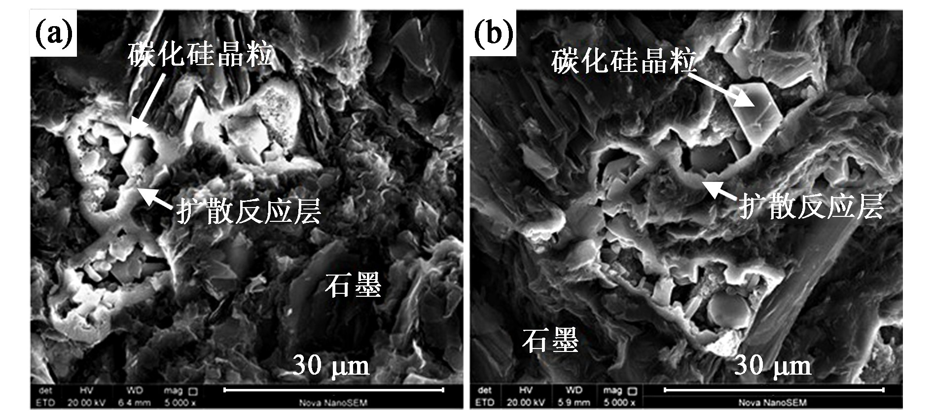 圖 1 為熔滲后石墨樣品的微觀形貌,從圖中可以看出,熔融硅能夠滲入到石墨的孔隙結(jié)構(gòu)中。 GS樣品與 GM 樣品的微觀形貌相似,在熔滲區(qū)域,均能觀察到石墨孔隙周邊形成了一層均勻的 SiC 擴(kuò)散反應(yīng)層,擴(kuò)散反應(yīng)層包裹的碳化硅呈較規(guī)則形狀,并且晶粒尺寸較大。 熔融滲硅過程中,靠近石墨的區(qū)域?yàn)榫Я3叽巛^小的碳化硅晶粒,也即 SiC 擴(kuò)散反應(yīng)層,而遠(yuǎn)離石墨區(qū)域?yàn)榫ЯiL大區(qū)域。 從微觀結(jié)構(gòu)中可以觀察到,擴(kuò)散反應(yīng)層包裹的區(qū)域內(nèi)部有孔隙,一方面,是由于制樣過程中,晶粒尺寸較大的碳化硅發(fā)生脫落;另一方面,熔滲過程中 1 mol 碳與 1 mol 硅發(fā)生反應(yīng)生成 1mol 碳化硅,碳化硅的摩爾體積為 12.4cm3,硅的摩爾體積為 11.1 cm3,碳的摩爾體積為 6.53 cm3,由于碳化硅的摩爾體積(12.4 cm3)小于硅與碳的摩爾體積之和(17.63 cm3),致使反應(yīng)后體積減小了 5.23 cm3,如果反應(yīng)后減少的空間沒有硅進(jìn)行填充,會(huì)導(dǎo)致孔隙產(chǎn)生。