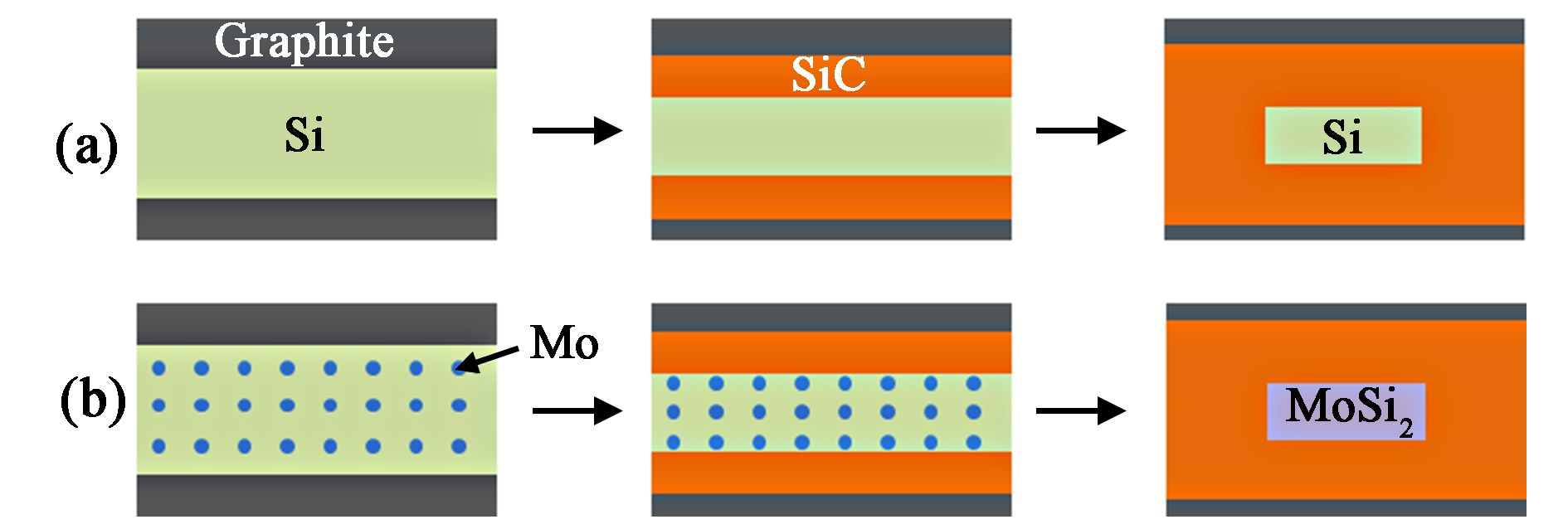 熔融滲硅工藝是一種常見的石墨、 炭/炭、炭纖維增強(qiáng)碳化硅及碳化硅纖維增強(qiáng)碳化硅復(fù)合材料致密化方法,該方法通過在高溫下將熔融狀態(tài)的硅引入多孔體中與碳發(fā)生反應(yīng),從而實(shí)現(xiàn)致密化。 熔融滲硅工藝的優(yōu)點(diǎn)是成本低、周期短;缺點(diǎn)是熔滲后基體中有自由硅殘留,影響材料的高溫性能。