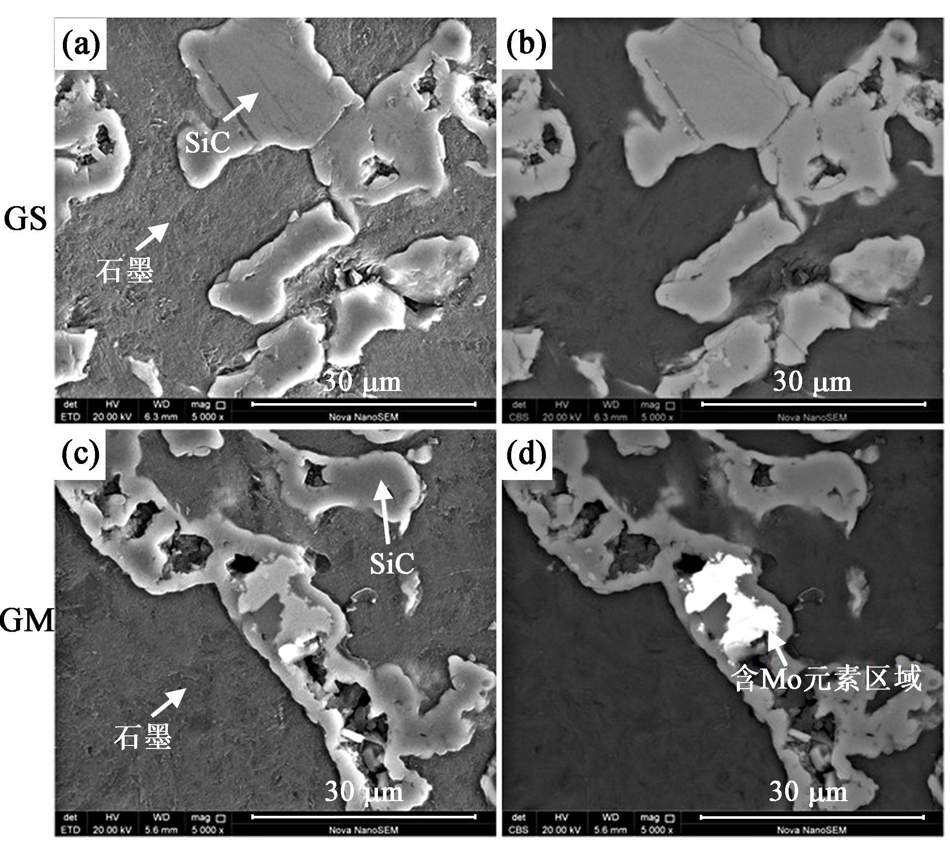 圖 2 為磨平后的 GS 樣品與 GM 樣品電子圖像與背散射電子圖像。 通過對(duì)比可以發(fā)現(xiàn),GS 樣品中僅檢測(cè)到 2 種元素,顏色較淺的區(qū)域?yàn)樘蓟杌蚬?,顏色較深區(qū)域?yàn)槭?GM 樣品中能夠觀察到 3 種不同明暗程度的區(qū)域,顏色較深的區(qū)域?yàn)槭?,顏色呈灰色的區(qū)域?yàn)樘蓟杌蚬?,而顏色明亮的為含鉬元素的區(qū)域,并且鉬元素主要分布在反應(yīng)層所包裹的區(qū)域,這可能是由于碳與硅的結(jié)合力更強(qiáng)所致。